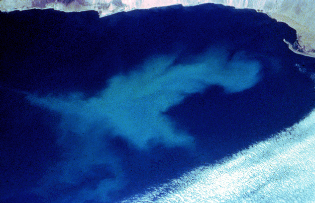 Plankton find a rich feeding ground in the cold waters lying off the Namibian Desert coast. They have found a narrow corridor of cold, nutrient-rich water in the Benguela Current along the coast. Just a few kilometers out to sea, the warmer waters of the Atlantic do no support the plankton. The band of clouds across the top right of the frame has been created by the interaction of the colder waters of the current and the atmosphere, so the boundary between the cold coastal waters of the Benguela Current is clearly evident to the space observer. It is one of the subtle wonders of the fragile earthly environment that plankton, and the fish that feed on them, should find such attractive feeding grounds sandwiched between the Namibian desert, one of the driest places on earth, and the warm, nutrient-poor waters of the central Atlantic. |