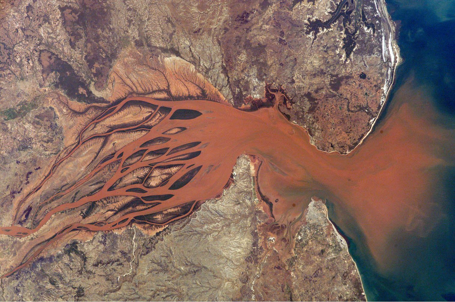 The Betsiboka is Madagascar's main river, flowing for a total of 525 kilometers (326 miles) from north of Tananarive. The river is navigable for at least 130 kilometers (81 miles) inland and the lower reaches pictured here are noted for their extensive rice fields. While the red sediment being transported provides an attractive and informative example of a river estuary, it is a symptom of an ecological disaster for Madagascar. Humans have felled and cleared the island's natural cover of tropical forest so extensively that soil erosion has been vastly accelerated. Much of the sediment visible in the river represents an irreplaceable natural asset.