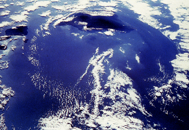The combination of warm water temperature and hundreds of square miles of ocean, uninterrupted by land masses, results in a regular cumulus and stratocumulus cloud formation. In the Pacific Ocean the Trade Winds propel the clouds from east to west across the ocean. When the air current is intercepted by a sufficiently high land mass, such as the Big Island of Hawaii, the stable cloud pattern is interrupted and the clouds divide to bypass the island in a wide arc forming an "island wake." In addition to illustrating how gracefully the clouds circumnavigate Hawaii's volcanic peaks, the photograph shows how the prevailing wind direction dictates that the north and northeast of the island are wetter than the western side of the island and frequently under cloud. The clouds deposit rain on the low ground before dividing and spinning out to sea when they meet the Kohala Mountains and Mauna Kea with its summit at 4,205 meters (13,796 feet). |