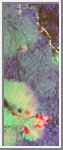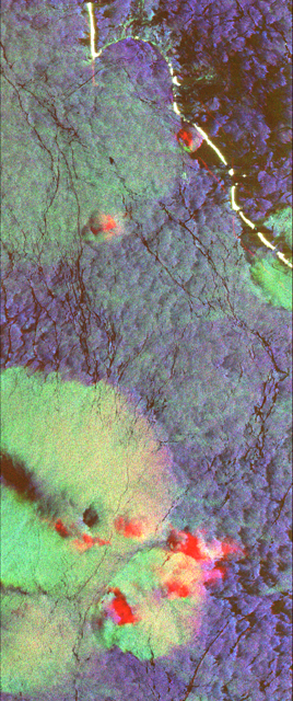 This radar image shows the ocean surface in a portion of the Western Pacific Ocean. Scientists are using images like this to study the occurrence, distribution and activity of tropical rain squalls and to understand the exchange of heat between the atmosphere and ocean and the upper layer mixing in the tropical oceans, which are critical factors for understanding the driving forces which produce the El Nino phenomenon. The white, curved area at the top of the image is a portion of the Ontong Java Atoll, part of the Solomon Islands group. The yellowish green area near the bottom of the image is an intense rain cell. This image is centered near 5.5 degrees South latitude and 159.5 degrees East longitude. The area shown is 50 kilometers by 21 kilometers (31 miles by 13 miles). This image was acquired by the Spaceborne Imaging Radar-C/X-Band Synthetic Aperture Radar (SIR-C/X-SAR) aboard the space shuttle Endeavour on its 13th orbit on April 10, 1994. The colors in the image are assigned to different frequencies and polarizations of the SIR-C radar as follows: Red is C-band horizontally transmitted and received; green is L-band horizontally transmitted and vertically received and blue is L-band horizontally transmitted and received. The large rain cell is about 15 kilometers by 15 kilometers (9 miles by 9 miles) and contains two dark regions, one circular and one rectangular, inside it. Two smaller reddish cells are visible closer to the atoll. The red areas may be caused by reflection from ice particles in the colder, upper portion of the storm cell and not from the ocean surface at all. This provides direct evidence that it is raining within this storm cell, valuable information which is usually very difficult to measure over more remote regions of the ocean away from coastal-based weather systems. The dark holes in the middle of the cell are thought to be areas of very heavy rainfall which actually smooth out the ocean surface and result in lower radar returns . The surrounding ocean is blue to green plus black. Winds and currents cause the ocean surface to be rough and those variations on the surface affect how the radar signals bounce off the surface. The bright areas on the image correspond to areas where the wind speed is high. The highest winds are seen as the yellow-green region of the large rain cell. The lowest winds are seen inside the atoll as dark areas. Outside the rain cell, the winds are moderately low, which is indicated by the puff-like, blue patterns surrounding the cell and extending into the atoll. The long, thin, dark lines extending across the ocean are surface currents. Here the currents are likely accumulating natural oils caused by small marine biological organisms. The oils cause the small, wind-generated waves to be reduced in size or damped which produces a smooth, dark zone on the radar image. Spaceborne Imaging Radar-C and X-band Synthetic Aperture Radar (SIR-C/X-SAR) is part of NASA's Mission to Planet Earth. The radars illuminate Earth with microwaves allowing detailed observations at any time, regardless of weather or sunlight conditions. SIR-C/X-SAR uses three microwave wavelengths: L-band (24 cm), C-band (6 cm) and X-band (3 cm). The multi-frequency data will be used by the international scientific community to better understand the global environment and how it is changing. The SIR-C/X-SAR data, complemented by aircraft and ground studies, will give scientists clearer insights into those environmental changes which are caused by nature and those changes which are induced by human activity. SIR-C was developed by NASA's Jet Propulsion Laboratory. X-SAR was developed by the Dornier and Alenia Spazio companies for the German space agency, Deutsche Agentur fuer Raumfahrtangelegenheiten (DARA), and the Italian space agency, Agenzia Spaziale Italiana (ASI), with the Deutsche Forschungsanstalt fuer Luft und Raumfahrt e.v.(DLR), the major partner in science, operations, and data processing of X-SAR. |
