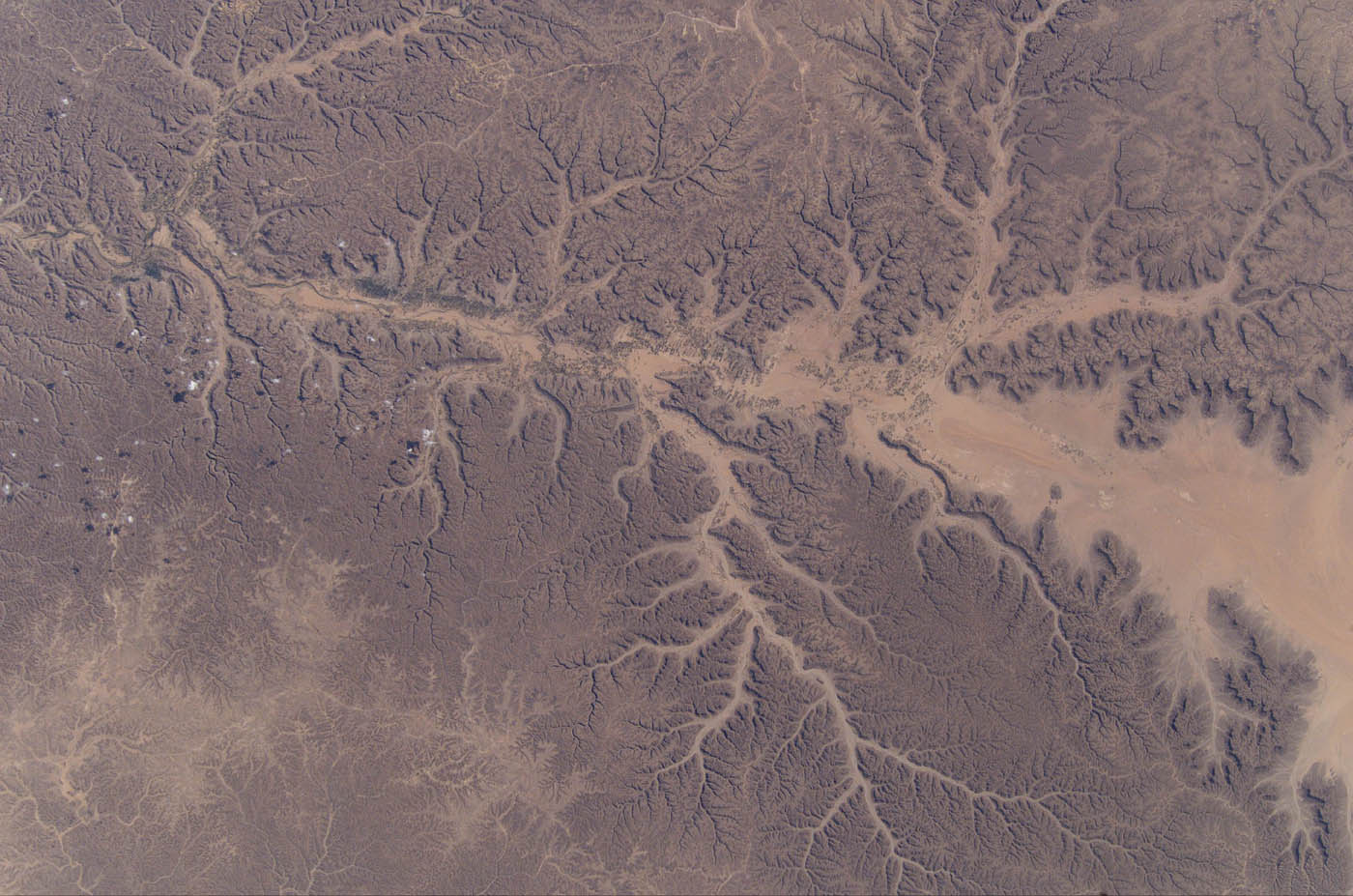 The Republic of South Yemen lies on the edge of one of the world's great sand seas, the Rubh-al-Khali, but even this dry desert region bears the unmistakable imprint of flowing streams and rivers. The branching pattern in the photograph could only have been produced by running water, draining off the surrounding land. These filigree patterns are termed "dendritic drainages" because of their similarity to the way in which trees branch out into progressively finer twigs. The term comes from the Greek dendrites, meaning tree-like. The dry gullies or waids appear to pose something of a paradox in an area that is apparently exceptionally arid desert, with no vestige of plant life. Freak rainstorms and flash flooding might deepen and extend the gullies, but they are far too infrequent at the present day to have produced the pattern seen here. The drainage pattern is clearly a fossil. When the Earth emerged from the last Ice Age, the Sahara and the Rubh-al-Khali were savanna grasslands with a more temperate climate and much higher rainfall than they experience today. Runoff from the coastal mountains carved the dendritic drainage pattern, which was then "fossilized" when the climate became more arid. |