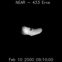 On February 10, four days before NEAR's insertion into orbit around Eros, the spacecraft's Multispectral Imager took this movie of the asteroid's rotation over one 5.27-hour Eros "day", from a range of 2050 miles (3300 kilometers). Features as small as a 1100 feet (330 meters) across can be seen. The most prominent, sharp-rimmed impact crater is on the opposite side of Eros form a huge, hollowed-out gouge, which may also have been caused by an impact. Between these features, and towards the ends of the "fat banana" shape of Eros, the asteroid's surface is covered with smaller craters. |