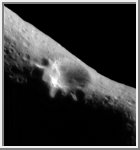 Today (February 14, 2000) at 10:33 AM EST the NEAR spacecraft was successfully inserted into orbit around 433 Eros, becoming the first artificial satellite of an asteroid. Just over an hour later, NEAR pointed its camera at the asteroid and took this picture from a range of 210 miles (330 km) above the surface. Mission navigators and operators will use this image and others to be taken later to traingulate on landmarks on the asteroid's surface, precisely measuring position of the spacecraft to plot NEAR's course. Features as small as a 100 feet (30 meters) across can be seen. This view shows the 3-mile (5-kilometer) impact crater which the spacecraft has spied for over a week during its approach. The two smaller craters superimposed on its rim are each about 1.2 miles (2 kilometers) across. An enormous boulder a full 170 feet (50 meters) in size sits on the large crater's floor. Other key features of the surface are shallow subsurface layering exposed near the tops of crater walls, and shallow grooves crossing the surface and cutting the crater's rim. (Mosaic of images 0125957025 and 0125957087) |