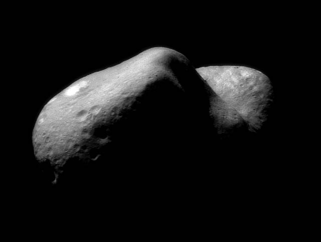 This incredible picture of Eros, taken on February 14, 2000, shows the view looking from one end of the asteroid across the gouge on its underside and toward the opposite end. In this mosaic, constructed from two images taken after the NEAR spacecraft was inserted into orbit, features as small as 120 feet (35 meters) across can be seen. House-sized boulders are present in several places; one lies on the edge of the giant crater separating the two ends of the asteroid. A bright patch is visible on the asteroid in the top left-hand part of this image, and shallow troughs can be see just below this patch. The troughs run parallel to the asteroid's long dimension. |