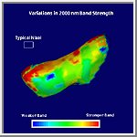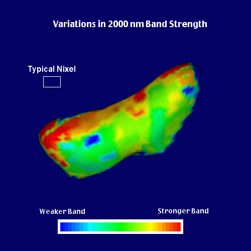 This image shows a map of the distribution of the 2000 nm band strength measured with the Near Infrared Spectrometer (NIS) on-board the NEAR spacecraft on February 13 and 14, 2000. The typical resolution element (called a "nixel") used for this map is 2x4 km. Blue areas have weaker absorption bands, yellow and red areas have stronger bands. The 2000 nm band is observed in reflected sunlight when the mineral pyroxene is present. Analysis of maps such as this combined with the results from the other instruments on-board NEAR over the coming year will help us understand the composition and history of Eros. Data Derived from NIS Low Phase Flyby sequences, Feb. 13-14, 2000; Mission Elapsed Times 125878216-125919596 |
