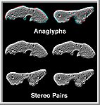 On 12 February, 2000, the NEAR spacecraft obtained a sequence of 780 images of Eros from a range of about 1800 km (1100 miles). This sequence covered one complete revolution of the asteroid at 0.5 degree intervals. In these views of opposite hemispheres of the asteroid, groups of images slightly apart in time were digitally processed to bring out local details. The processed data showing Eros from slightly different perspectives can then be combined as anaglyphs or stereo pairs. The processing of the data highlights the topography of small-scale features, but makes the gross shape of the asteroid appear flattened. (Product compiled from images 0125729047, 0125729073, 0125729099, 0125729125, 0125729151, 0125729177, 0125729203, 0125729229, 0125729255, 0125729281, 0125729307, 0125729333, 0125729359, 0125729385, 0125729411, 0125729437, 0125729463, 0125729489, 0125729515, 0125729541, 0125738407, 0125738433, 0125738459, 0125738485, 0125738511, 0125738537, 0125738563, 0125738589, 0125738615, 0125738641, 0125738667, 0125738693, 0125738719, 0125738745, 0125738771, 0125738797, 0125738823, 0125738849, 0125738875, 0125738901) |
