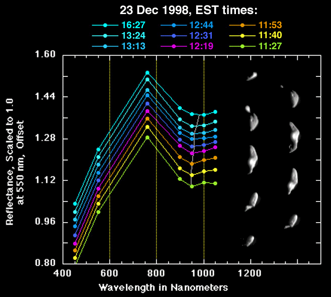 These spectral measurements of the asteroid Eros were taken on December 23, 1998 from the Near Earth Asteroid Rendezvous (NEAR) spacecraft as it flew by the asteroid. The measurements were compiled from data taken by the multispectral imager over 5 hours surrounding the closest approach at 2375 miles (3830 kilometers) from the asteroid at 1:43 PM EST. Each spectrum is a measure of the fraction of sunlight of different wavelengths that is reflected by the asteroid. The images at right show the asteroid's appearance at the times of the measurements. Different minerals reflect sunlight with a different spectrum, providing a "fingerprint" of composition of the asteroid's surface. The progressive shift in the depth and position of the trough in Eros's spectrum (traced by the thin gray line) results from subtle changes in the mixture of minerals exposed on different parts of the asteroid. |