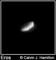 This image of asteroid 433 Eros was taken on January 27, 2000. Even at this resolution, the highly irregular shape of Eros is apparent. Over the next 3 weeks Eros will appear larger and larger until the NEAR spacecraft goes into orbit on Valentine's Day (February 14th). |