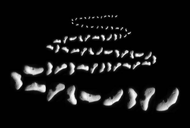 This montage shows a selection of images of the asteroid 433 Eros that were acquired from the NEAR spacecraft over three weeks from January 22 through February 12, 2000, as the spacecraft's distance from its target shrank from 18,000 to 1260 miles (29,000 to 2025 km). As the spacecraft closed in on its target, the resolution of the images increased from 1.7 to 0.12 miles (2.8 to 0.19 km) per pixel. At 20x8x8 miles in size (33x13x13 kilometers), Eros is the second largest near-Earth asteroid and spins on its axis once every 5 hours, 16 minutes. During the early stages of NEAR's approach, Eros appeared as a small blob only a few pixels across. The apparent size of Eros and the resolution of the pictures increased continuously, at first only slowly and later dramatically day by day until, on February 9, the level of detail visible exceeded that during NEAR's first flyby of Eros on December 23, 1998. In the last images shown here, details of Eros's surface have become visible. Heavy cratering has pockmarked the irregular asteroid's surface. One side is dominated by a scallop-rimmed gouge, and the opposite side by a conspicuous, raised-rimmed crater. (Images: 0124182130, 0124185068, 0124188103, 0124191138, 0124194173, 0124197034, 0124200069, 0124203051, 0124206021, 0124206397, 0124209013, 0124212066, 0124215044, 0124263133, 0124266253, 0124269373, 0124272493, 0124275613, 0124278733, 0124281853, 0124543933, 0124547053, 0124550173, 0124553293, 0124556413, 0124561093, 0124562653, 0124772331, 0125039735, 0125056325, 0125059465, 0125062605, 0125065745, 0125068885, 0125075950, 0125104854, 0125123255, 0125137235, 0125209535, 0125218007, 0125221023, 0125224039, 0125227003, 0125230019, 0125236153, 0125239046, 0125242991, 0125245884, 0125248245, 0125252196, 0125255087, 0125270154, 0125312200, 0125324200, 0125342200, 0125389000, 0125460640, 0125494933, 0125501173, 0125507413, 0125513653, 0125640955, 0125647625, 0125650641, 0125653631, 0125656621, 0125659611, 0125662627, 0125665617, 0125693155, 0125720155) |