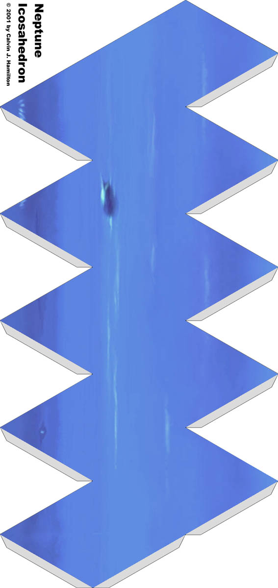 Neptune is the outermost planet of the gas giants. It has an equatorial diameter of 49,500 kilometers (30,760 miles). This icosahedron of Neptune was created from a mosaic of Voyager image data. It can be assemble by cutting along the edges of the map. Tape or glue can be used to assemble the globe. Double-sided tape works well. The challenge is in connecting the last edges together. Good luck and have fun. This image is Copyrighted © 2001 by Calvin J. Hamilton. Any commercial/for-profit use of this image needs to be addressed to Calvin J. Hamilton. |