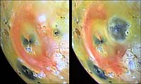 These images of Jupiter's volcanic moon, Io, show the results of a dramatic event that occurred on the fiery satellite during a five-month period. The changes, captured by the solid state imaging (CCD) system on NASA's Galileo spacecraft, occurred between the time Galileo acquired the left frame, during its seventh orbit of Jupiter, and the right frame, during its tenth orbit. A new dark spot, 400 kilometers (249 miles) in diameter, which is roughly the size of Arizona, surrounds a volcanic center named Pillan Patera. Galileo imaged a 120 kilometer (75 mile) high plume erupting from this location during its ninth orbit. Pele, which produced the larger plume deposit southwest of Pillan, also appears different than it did during the seventh orbit, perhaps due to interaction between the two large plumes. Pillan's plume deposits appear dark at all wavelengths. This color differs from the very red color associated with Pele, but is similar to the deposits of Babbar Patera, the dark feature southwest of Pele. Some apparent differences between the images are not caused by changes on Io's surface, but rather are due to differences in illumination, emission and phase angles. This is particularly apparent at Babbar Patera. North is to the top of the images. The left frame was acquired on April 4th, 1997, while the right frame was taken on Sept. 19th, 1997. The images were obtained at ranges of 563,000 kilometers (350,000 miles) for the left image, and 505,600 kilometers (314,165 miles) for the right. |