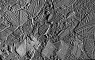 This mosaic of the Conamara Chaos region on Jupiter's moon, Europa, clearly indicates relatively recent resurfacing of Europa's surface. Irregularly shaped blocks of water ice were formed by the break up and movement of the existing crust. The blocks were shifted, rotated, and even tipped and partially submerged within a mobile material that was either liquid water, warm mobile ice, or an ice and water slush. The presence of young fractures cutting through this region indicates that the surface froze again into solid, brittle ice. The background image in this picture was taken during Galileo's sixth orbit of Jupiter in February, 1997. Five very high resolution images which were taken during the spacecraft's twelfth orbit in December, 1997 provide an even closer look at some of the details. This mosaic shows some of the high resolution data inset into the context of this tumultuous region. North is to the top of the picture, and the sun illuminates the scene from the east (right). The picture, centered at 9 degrees north latitude and 274 degrees west longitude, covers an area approximately 35 by 50 kilometers (20 by 30 miles). The finest details visible in the very high resolution insets are about 20 meters (22 yards) across, and in the background image, 100 meters (110 yards) across. The insets were taken on December 16, 1997, at ranges as close as 880 kilometers (550 miles) by the Solid State Imaging (SSI) system on NASA's Galileo spacecraft. |
