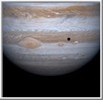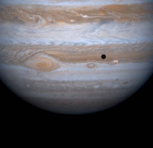 Jupiter's four largest satellites, including Io, the golden ornament in front of Jupiter in this image from NASA's Cassini spacecraft, have fascinated Earthlings ever since Galileo Galilei discovered them in 1610 in one of his first astronomical uses of the telescope. Images from Cassini that will be released over the next several days capture each of the four Galilean satellites in their orbits around the giant planet. This true-color composite frame, made from narrow angle images taken on Dec. 12, 2000, captures Io and its shadow in transit against the disk of Jupiter. The distance of the spacecraft from Jupiter was 19.5 million kilometers (12.1 million miles). The image scale is 117 kilometers (73 miles) per pixel. The entire body of Io, about the size of Earth’s Moon, is periodically flexed as it speeds around Jupiter and feels, as a result of its non-circular orbit, the periodically changing gravitational pull of the planet. The heat arising in Io's interior from this continual flexure makes it the most volcanically active body in the solar system, with more than 100 active volcanoes. The white and reddish colors on its surface are due to the presence of different sulfurous materials. The black areas are silicate rocks. |