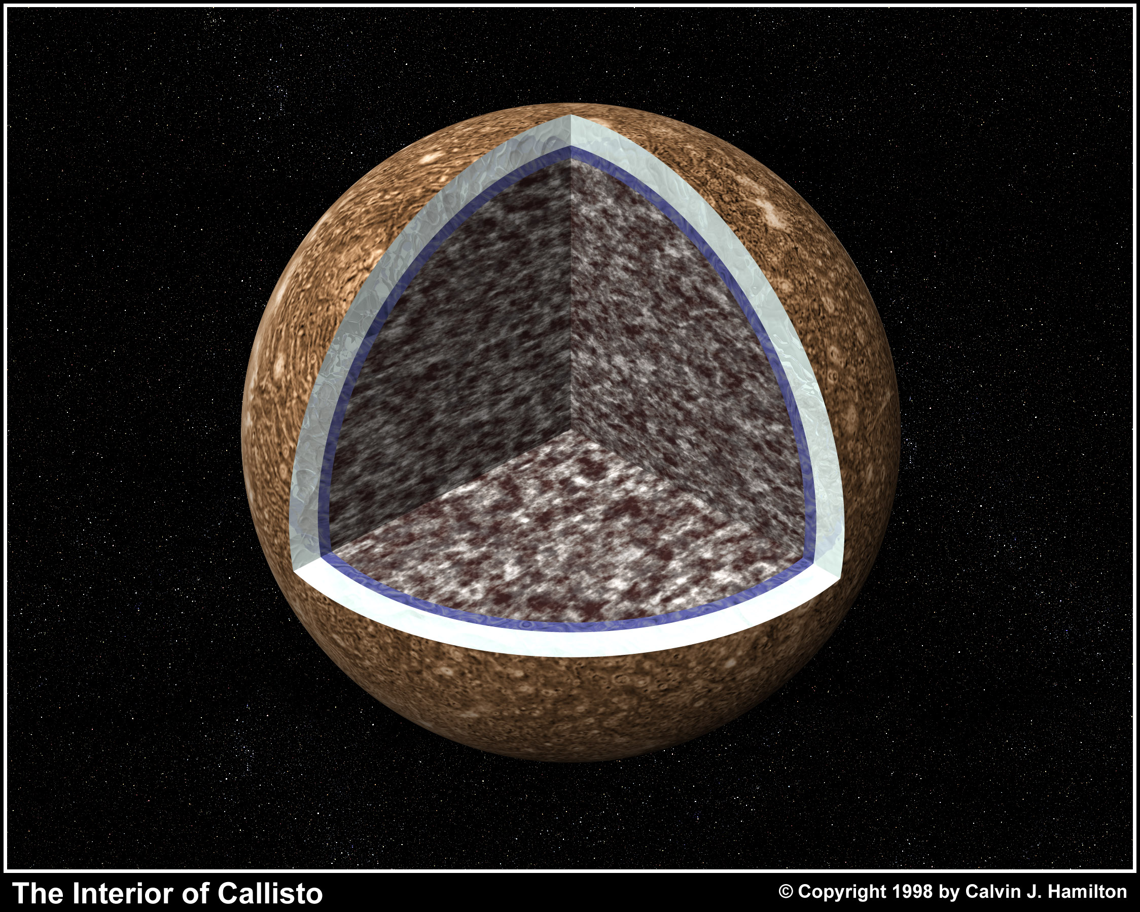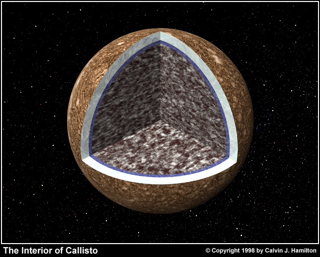 This artistic cutaway view shows a model of the interior of Jupiter's moon Callisto. Before the Galileo spacecraft, Callisto was thought to be an inactive moon -- just a chunk of rock and ice. Data recently obtained from the Galileo spacecraft has revealed the surprising result that Callisto might have a salty ocean lying beneath its icy crust. Callisto is the most heavily cratered satellite in the solar system. Its battered surface lies on top of an icy layer (shown as a whitish band) that is about 200 kilometers (124 miles) thick. The crust is very ancient and dates back 4 billion years, just shortly after the solar system was formed. The new data from Galileo indicates that beneath the crust lies an ocean as indicated by the blue band. The depth of the ocean probably exceeds 10 kilometers (6 miles). "The new [Galileo] data certainly suggest that something is hidden below Callisto's surface, and that something may very well be a salty ocean," said Dr. Margaret Kivelson, space physics professor at the University of California at Los Angeles. The premise of an ocean came from studying the magnetic fields around Jupiter and its moons. It was found that Callisto's magnetic field varies (flows in various directions at different times) in response to the background magnetic field generated by Jupiter. Beneath the ocean, Callisto seems to have a strange interior that is not entirely uniform and does not vary dramatically. Prior to Galileo, scientists believed that Callisto's interior was totally undifferentiated, but Galileo data suggests that the interior is composed of compressed rock and ice with the percentage of rock increasing as depth increases. |