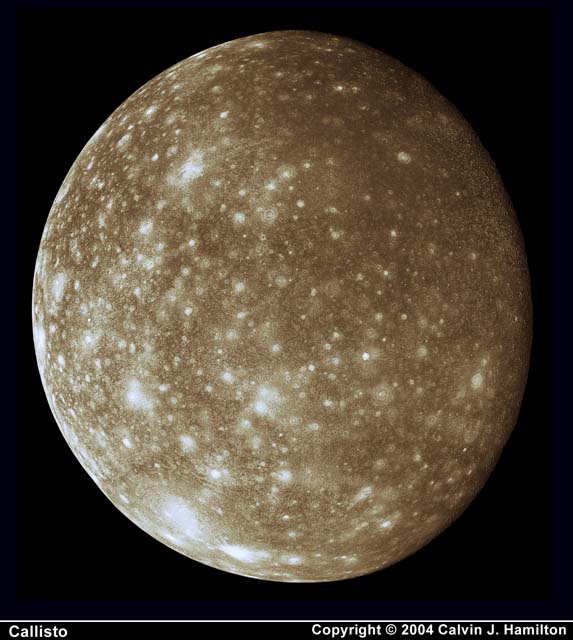 Jupiter's icy moon Callisto is shown here in approximate natural color. At the lower left is the impact structure, Asgard surrounded by concentric rings up to 1,700 kilometers (about 1,050 miles) in diameter. A second ringed structure with a diameter of about 500 kilometers (310 miles) is just below Asgard, partially obscured by the more recent, bright-rayed crater, Burr. The icy materials excavated by the younger craters contrast sharply with the darker and redder coatings on older surfaces of Callisto. These bright areas are believed to contain more clean ice than the rest of Callisto's generally 'dirty-ice' surface. |