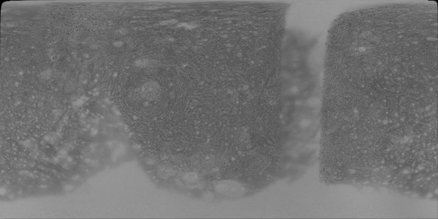 This grayscale simple cylindrical map of Callisto was produced by the USGS from Voyager spacecraft image data. |