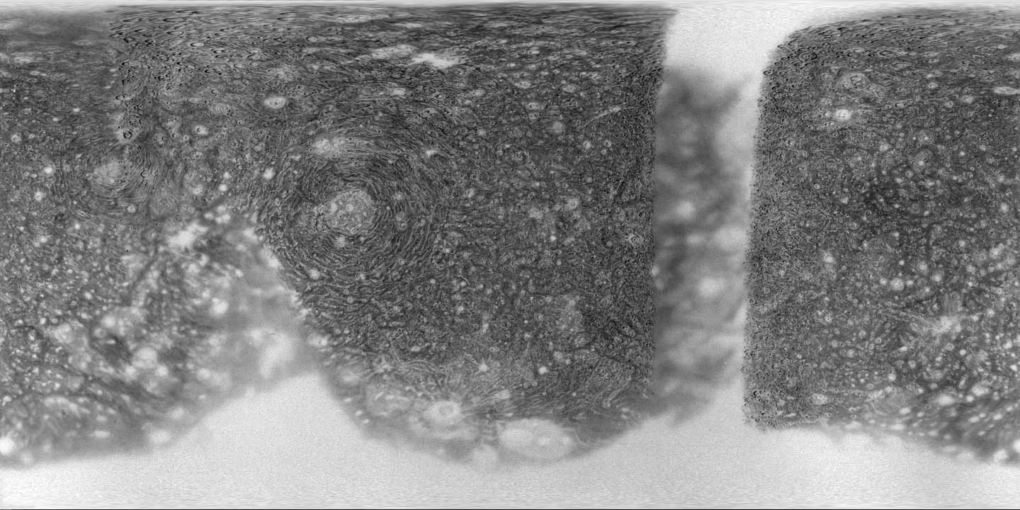 This is an enhanced version of the cylindrical map of Callisto produced by the USGS from Voyager spacecraft image data. |