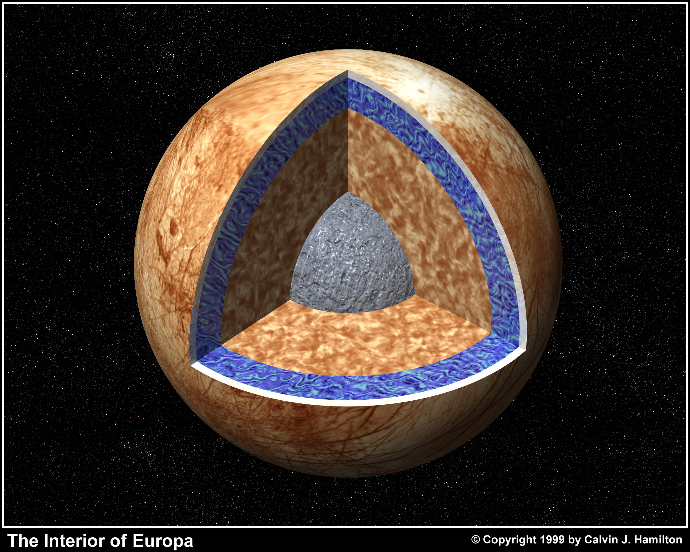 This cutaway view shows the possible internal structure of Europa. It was created by using a mosaic of images obtained in 1979 by NASA's Voyager spacecraft. The interior characteristics are inferred from gravity field and magnetic field measurements by the Galileo spacecraft. Europa's radius is 1565 km, not too much smaller than our Moon's radius. Europa has a metallic (iron, nickel) core (shown in gray) drawn to the correct relative size. The core is surrounded by a rock shell (shown in brown). The rock layer of Europa (drawn to correct relative scale) is in turn surrounded by a shell of water in ice or liquid form (shown in blue and white and drawn to the correct relative scale). The surface layer of Europa is shown as white to indicate that it may differ from the underlying layers. Galileo images of Europa suggest that a liquid water ocean might now underlie a surface ice layer several to ten kilometers thick. However, this evidence is also consistent with the existence of a liquid water ocean in the past. It is not certain if there is a liquid water ocean on Europa at present. |