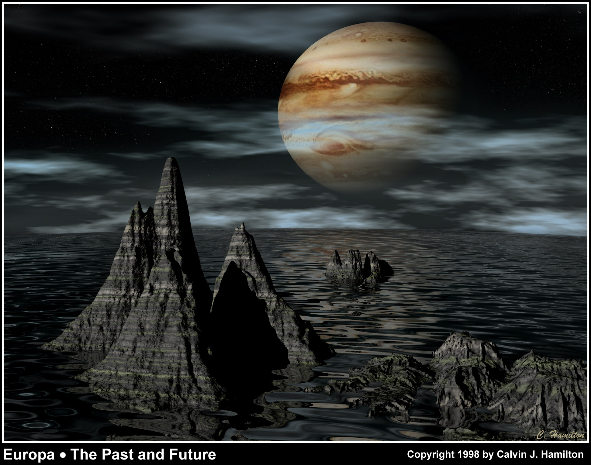 This artistic picture represents Europa during the dawn of the Solar System's creation. At this point, in time oceans graced the surface of Europa. Since liquid water existed in the past, could life have formed and even exist today? The primary ingredients for life are water, heat, and organic compounds obtained from comets and meteorites. Europa has had all three. From the images and data collected by the Galileo spacecraft, scientists believe that a subsurface ocean existed in relative recent history and may still be present beneath the icy surface. Europa's water should have frozen long ago, but warming could be occurring due to the tidal tug of war with Jupiter and neighboring moons. This artistic picture can also represent Europa 7 billion years hence, after the Sun has become a red giant. The heat from the aging sun should be sufficient to melt the ice and once again produce an ocean. This picture is © copyright 1998 by Calvin J. Hamilton. Any use of this image needs to be addressed to Calvin J. Hamilton. |