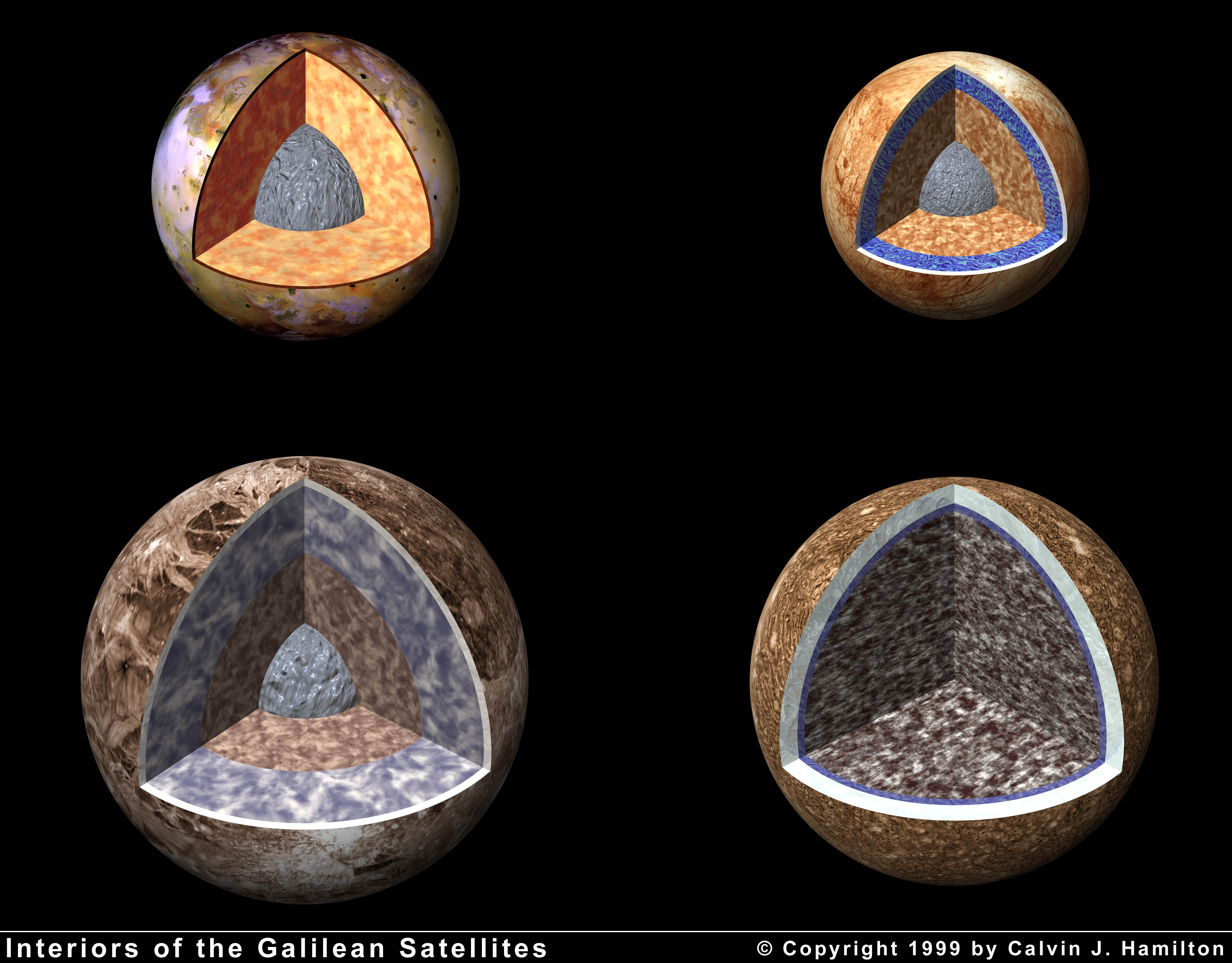 These cutaway views show the possible internal structures of the Galilean satellites. Io is at the top left, Europa is at the top right, Ganymede is at the bottom left, and Callisto at the bottom right. The satellites are shown at their relative correct sizes. Io has a radius of 1,821 kilometers which is slightly smaller than the moon at a radius of 1738 kilometers. Europa's radius is 1,565 kilometers, Ganymede's radius is 2634 kilometers, and Callisto's radius is 2403 kilometers. The surfaces of the satellites were derived from image data taken by NASA's Voyager and Galileo spacecrafts. The interior characteristics are inferred from gravity field and magnetic field measurements taken by the Galileo spacecraft. With the exception of Callisto, all the satellites have metallic (iron, nickel) cores (shown in gray) drawn to the correct relative size. Again, with the exception of Callisto, all the cores are surrounded by rock shells. Io's rock or silicate shell extends to the surface, while the rock layers of Ganymede and Europa (drawn to correct relative scale) are in turn surrounded by shells of water in ice or liquid form (shown in blue and white and drawn to the correct relative scale). Callisto is shown as a relatively uniform mixture of comparable amounts of ice and rock that extends up to a possible salty ocean (shown in blue) beneath a thick icy crust (shown in white). The surface layers of Ganymede and Callisto are shown as white to indicate that they may differ from the underlying ice/rock layers in a variety of ways including, for example, the percentage of rock they contain. The white surface layer on Europa could have similar significance, although it could also suggest an ice layer overlying a liquid water ocean. Galileo images of Europa suggest that a liquid water ocean might now underlie a surface ice layer several to ten kilometers thick; however, this evidence is also consistent with the existence of a liquid water ocean in the past. It is not certain if there is a liquid water ocean on Europa at present. |