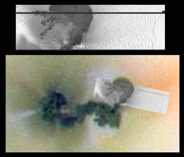 This is a high-resolution image of part of Prometheus, an active volcano on Jupiter's volcanic moon Io. The image was taken by NASA's Galileo spacecraft on October 10, 1999, during its close flyby of Io. It shows a volcanic caldera, a large depression formed by the collapse of the ground after a volcanic eruption. Some terrestrial examples of calderas can be found in Hawaii. This image also shows dark lava flows and a strange, lumpy surface covered with sulfur-rich snow. The new image is shown over an earlier, color view. In earlier, lower resolution images, it appeared that all the dark material at Prometheus comprised a single, long lava flow. The new image shows for the first time that the northeastern end of this dark feature is actually a lava-filled caldera 28 kilometers (17 miles) long and 14 kilometers (9 mile s) wide. The underground source of the Prometheus lava is probably beneath this newly discovered caldera. The lava flows that spill over the west rim of the newly discovered caldera clearly indicate that, at some point in time, the entire caldera was filled with lava. It is not clear whether the lava to the south of the caldera originally erupted within the caldera and flowed out, or if it erupted from a vent in the south and then flowed north into the caldera. Galileo scientists are intrigued also by the snowfield containing hummocks, seen to the east of the Prometheus caldera. They are currently examining a number of alternative models for their formation. One idea is that the hummocks, or routed knolls, are the results of the supersonic blasts from Io's volcanoes plastering material onto one side of pre-existing lumps on the ground. The black and white, high-resolution image was taken with a filter that let in only a part of of the infrared spectrum close to the visible wavelengths. The "color" of materials in the infrared is an important tool in determining the chemical composition of planetary surfaces. North is to the top of the picture and the sun illuminates the surface from almost behind the spacecraft. The resolution is 120 meters (400 feet) per pixel element. This resolution is more than 10 times better than the previous best view of this region. The image covers an area about 96 kilometers (60 miles) wide and 29 kilometers (18 miles) high. It was taken at a distance of 12,000 kilometers (7,500 miles) from Io by the camera onboard Galileo. |