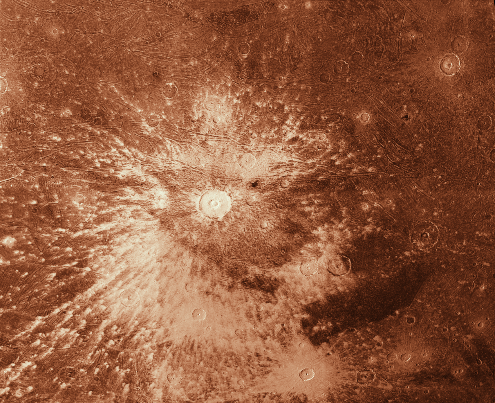 This mosaic of high resolution images on Ganymede shows a relative fresh impact basin surrounded by ejecta. This image is Copyright © by Calvin J. Hamilton. Any commercial/for-profit use of this image needs to be addressed to Calvin J. Hamilton. |
