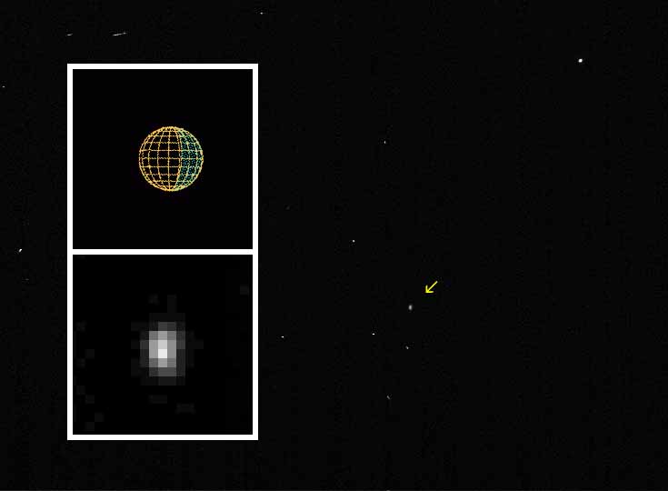 The brightest of Jupiter's outer satellites, Himalia, was captured and resolved, for the first time, in a series of narrow angle images taken on December 19, 2000 from a distance of 4.4 million kilometers during the brief period when Cassini's attitude was stabilized by thrusters instead of reaction wheels. This particular 1.0 second exposure was one of the sharpest, with a resolution of ~ 27 km/pixel, and was taken through a near-infrared spectral filter at 1:07 UTC (spacecraft time). The arrow indicates Himalia. North is up. The inset shows the satellite magnified by a factor of 10 and a graphic indicating Himalia's size and phase (the sunlight is coming from the left). It is likely that Himalia is not spherical: it is believed to be a body captured into orbit around Jupiter and as such, is likely to be an irregularly shaped asteroid. At the time this image was acquired, the dimensions of the side of Himalia facing the cameras is roughly 160 km in the up/down direction. |