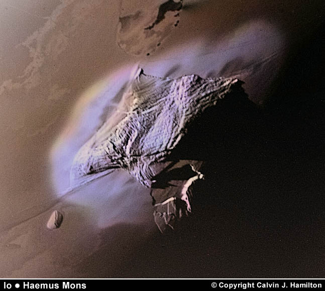 Haemus Mons is a mountain located near the south pole and in this image near the terminator of Io. Its base measures about 200 by 100 kilometers (124 by 62 miles). Several mountain peaks are found on Io some measuring as high as 10 kilometers (6.2 miles) tall. This image is Copyright © by Calvin J. Hamilton. Any commercial/for-profit use of this image needs to be addressed to Calvin J. Hamilton. |