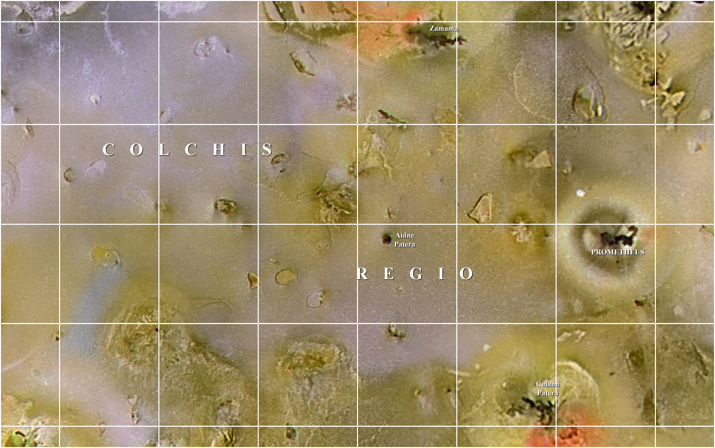 This map of Io is in Mercator Projection and covers longitudes 216 to 144 degrees and latitudes 22 to -22 degrees. It was constructed using black and white image data from the Voyager and Galileo spacecraft and coloring the resulting map with the the color channels from lower resolution color images taken by Galileo. Images used for the map are selected for maximum detail and not for current appearance. Io is the most active body in the solar system and surface features are changing in short times. |
