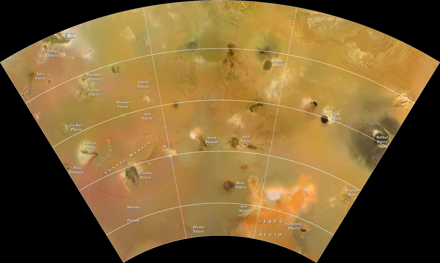 This map of Io is in Lambert Conformal Conic Projection and covers longitudes 360 to 270 degrees and latitudes -21 to -66 degrees. It was constructed using black and white image data from the Voyager and Galileo spacecraft and coloring the resulting map with the the color channels from lower resolution color images taken by Galileo. Images used for the map are selected for maximum detail and not for current appearance. Io is the most active body in the solar system and surface features are changing in short times. |