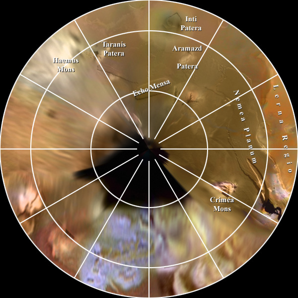 This map of Io is in a Polar Stereographic Projection and covers latitudes -65 to -90 degrees. It was constructed using black and white image data from the Voyager and Galileo spacecraft and coloring the resulting map with the the color channels from lower resolution color images taken by Galileo. Images used for the map are selected for maximum detail and not for current appearance. Io is the most active body in the solar system and surface features are changing in short times. |