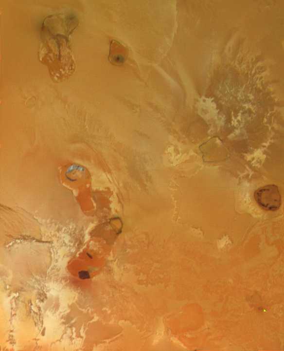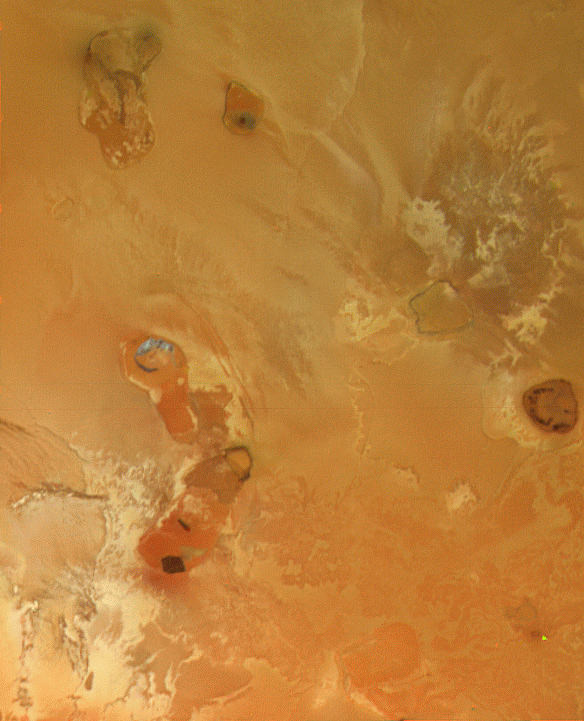 This photograph of Jupiter's satellite Io shows what appears to be a volcanic caldera that is venting gasses (the bright blue patch at left center). In the photo is a network of volcanic calderas with dark floors linked by bright red materials. The northernmost caldera has a bright blue patch on the floor. Scientists believe the bright blue patch may be clouds of gas issuing from volcanic vents. The gas clouds may condense to form extremely fine particles that appear blue. Since Voyager 1's infrared spectrometer has discovered sulfur dioxide on Io, it is possible that sulfur dioxide is the main component of the clouds. Sulfur dioxide clouds would rapidly freeze and snow back to the surface. It is also possible that dark areas in the floors of the calderas are pools of molten sulfur, a very dark form of sulfur. The picture was taken March 5, 1979, as Voyager 1 approached Io. Photo was taken from 80,500 miles (129,600 kilometers). |