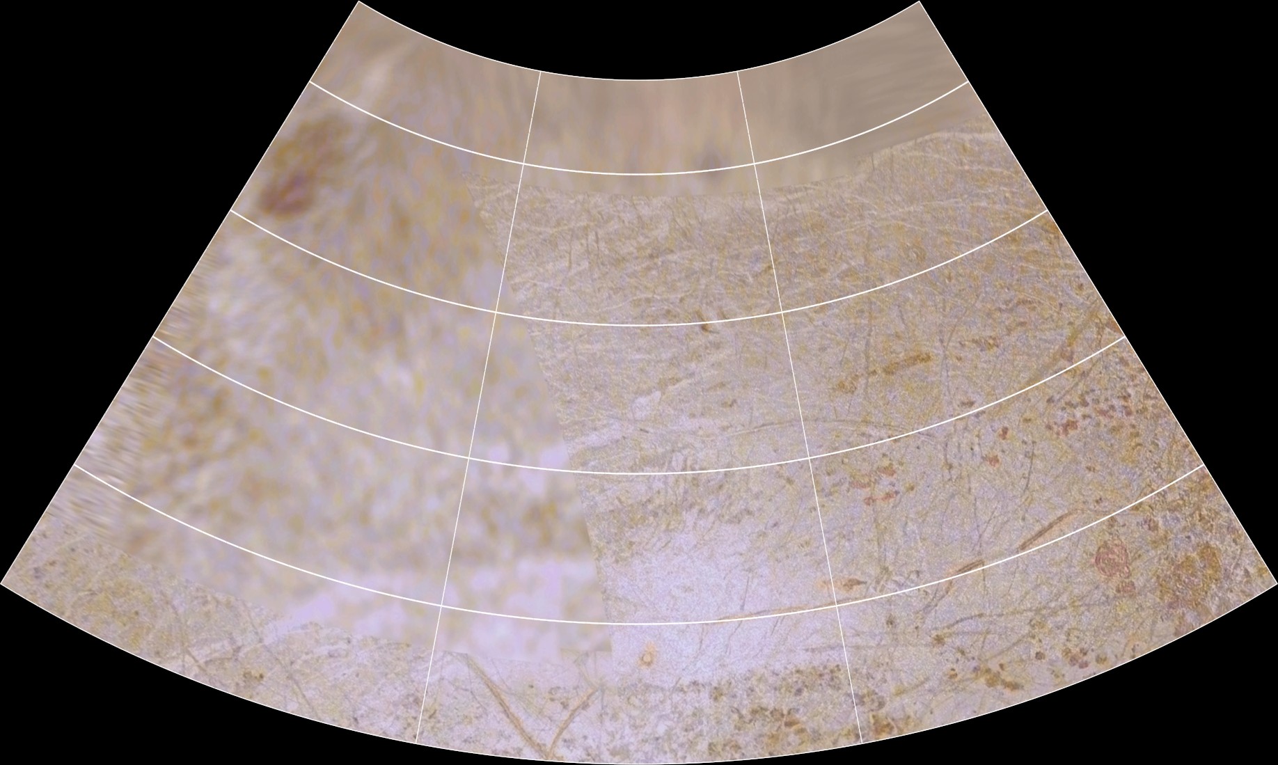 This map of Europa is in Lambert Conformal Conic Projection and covers longitudes 90 to 0 degrees and latitudes 66 to 21 degrees. |