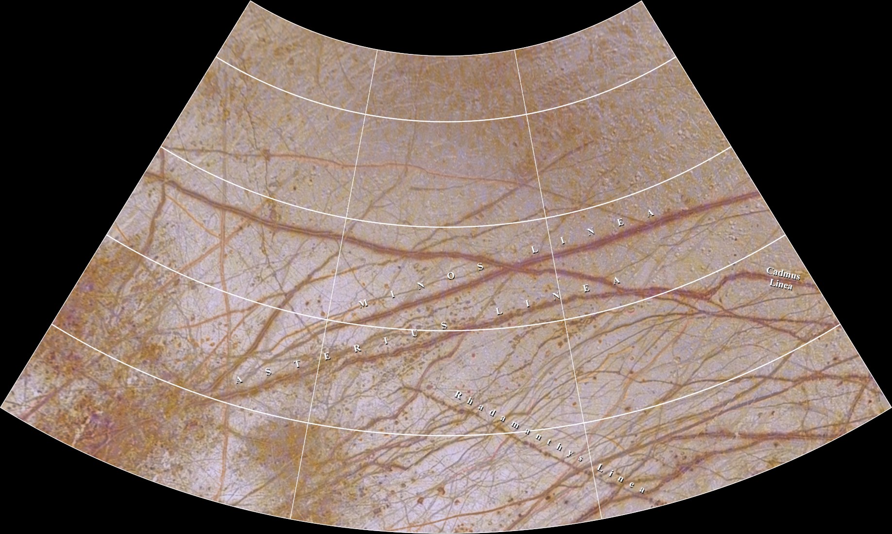 This map of Europa is in Lambert Conformal Conic Projection and covers longitudes 270 to 180 degrees and latitudes 66 to 21 degrees. |