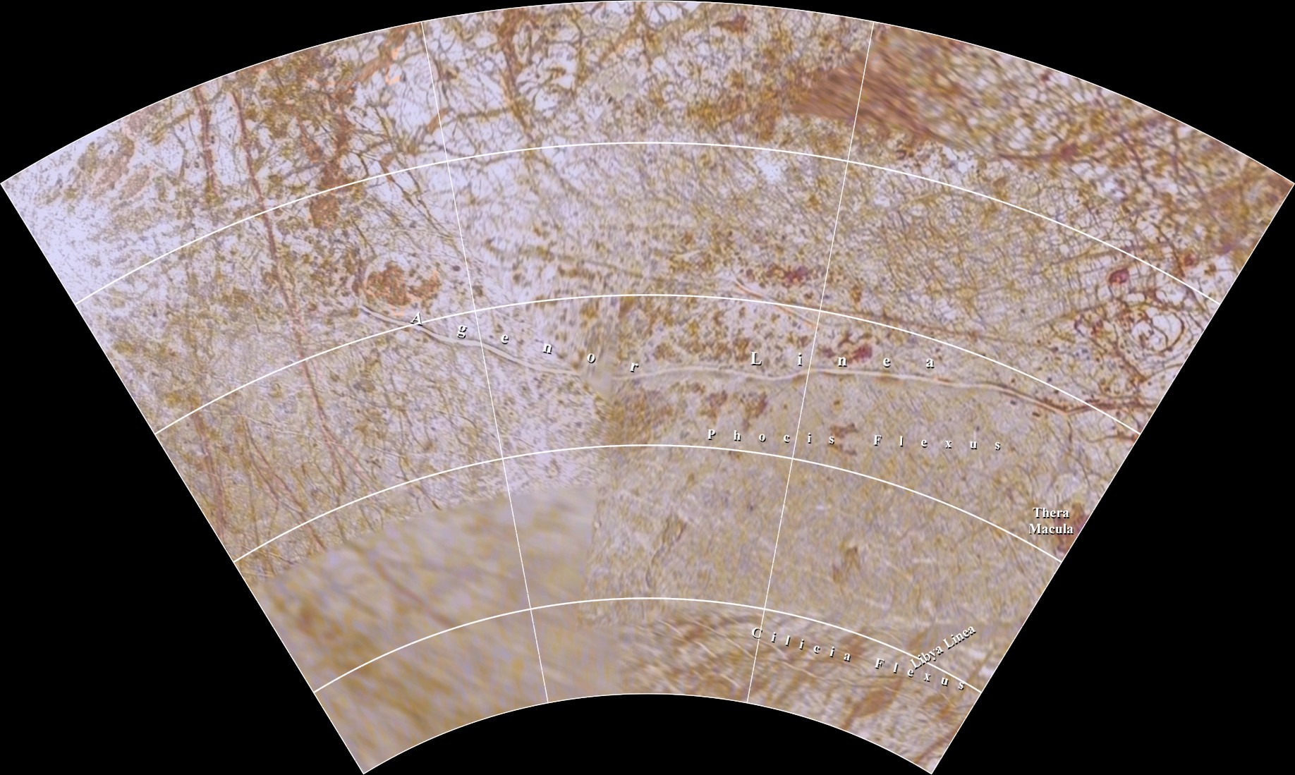 This map of Europa is in Lambert Conformal Conic Projection and covers longitudes 270 to 180 degrees and latitudes -21 to -66 degrees. |