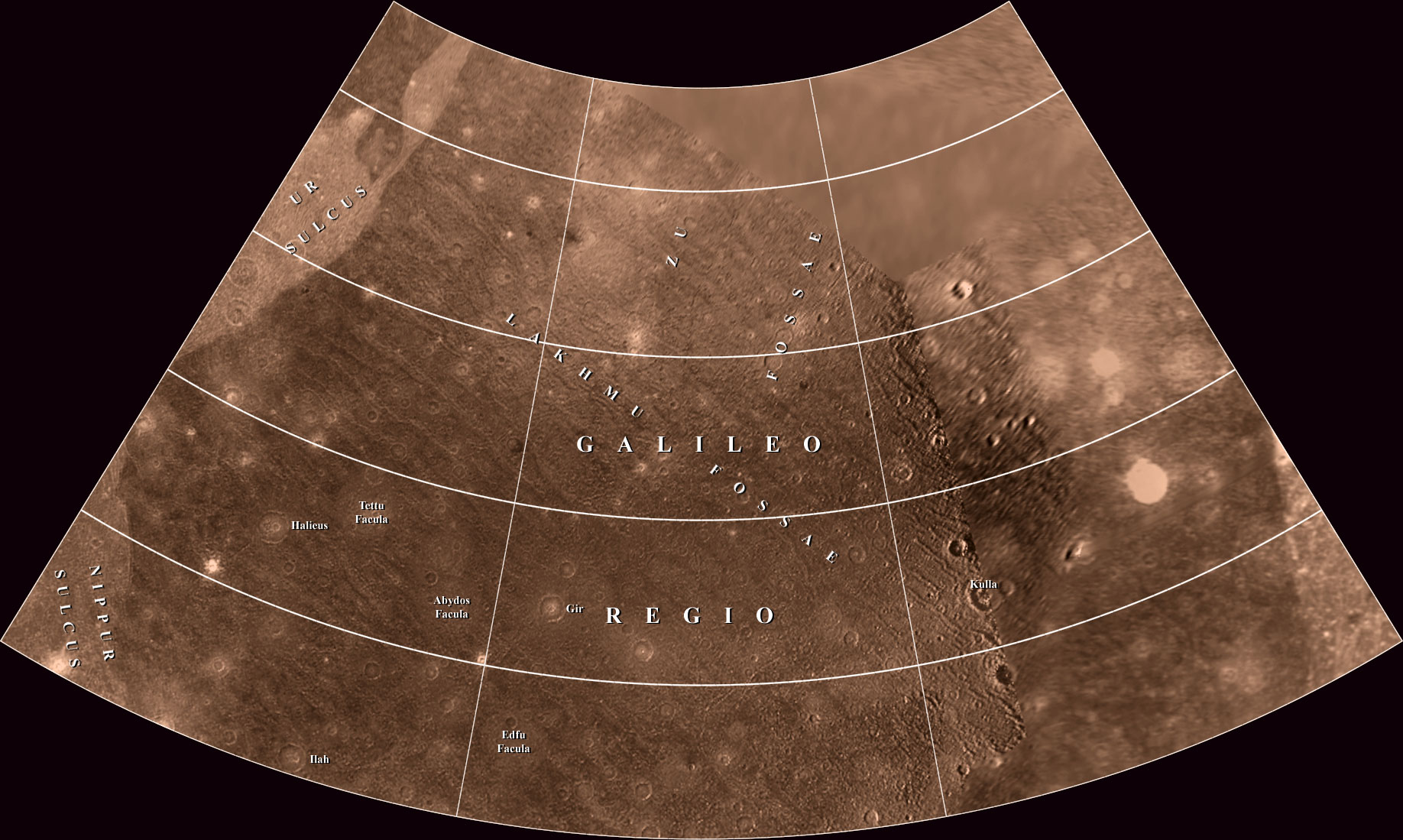 This map of Ganymede is in Lambert Conformal Conic Projection and covers longitudes 180 to 90 degrees and latitudes 66 to 21 degrees. |