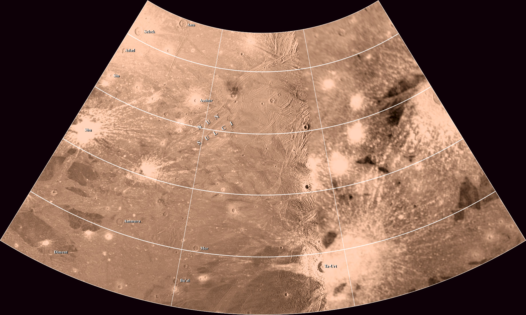 This map of Ganymede is in Lambert Conformal Conic Projection and covers longitudes 360 to 270 degrees and latitudes 66 to 21 degrees. |