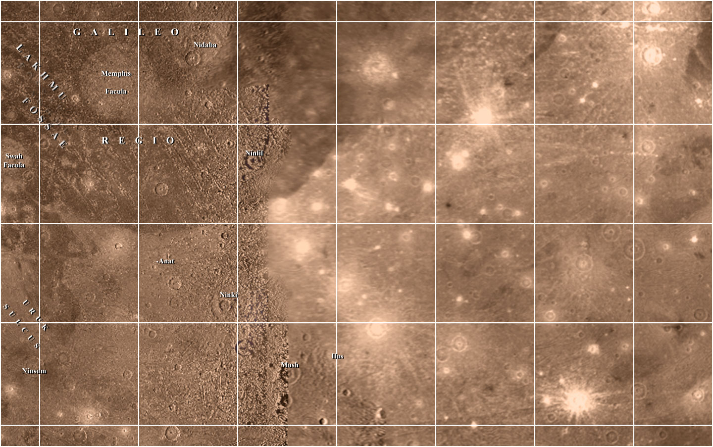 This map of Ganymede is in Mercator Projection and covers longitudes 144 to 72 degrees and latitudes 22 to -22 degrees. |