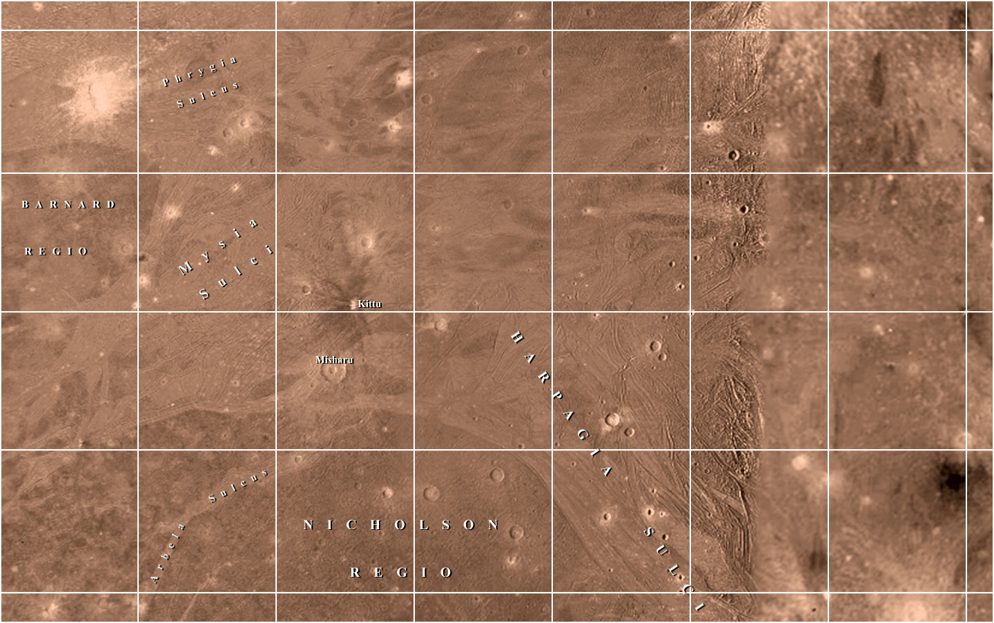 This map of Ganymede is in Mercator Projection and covers longitudes 360 to 288 degrees and latitudes 22 to -22 degrees. |