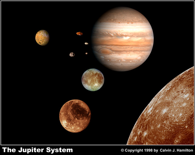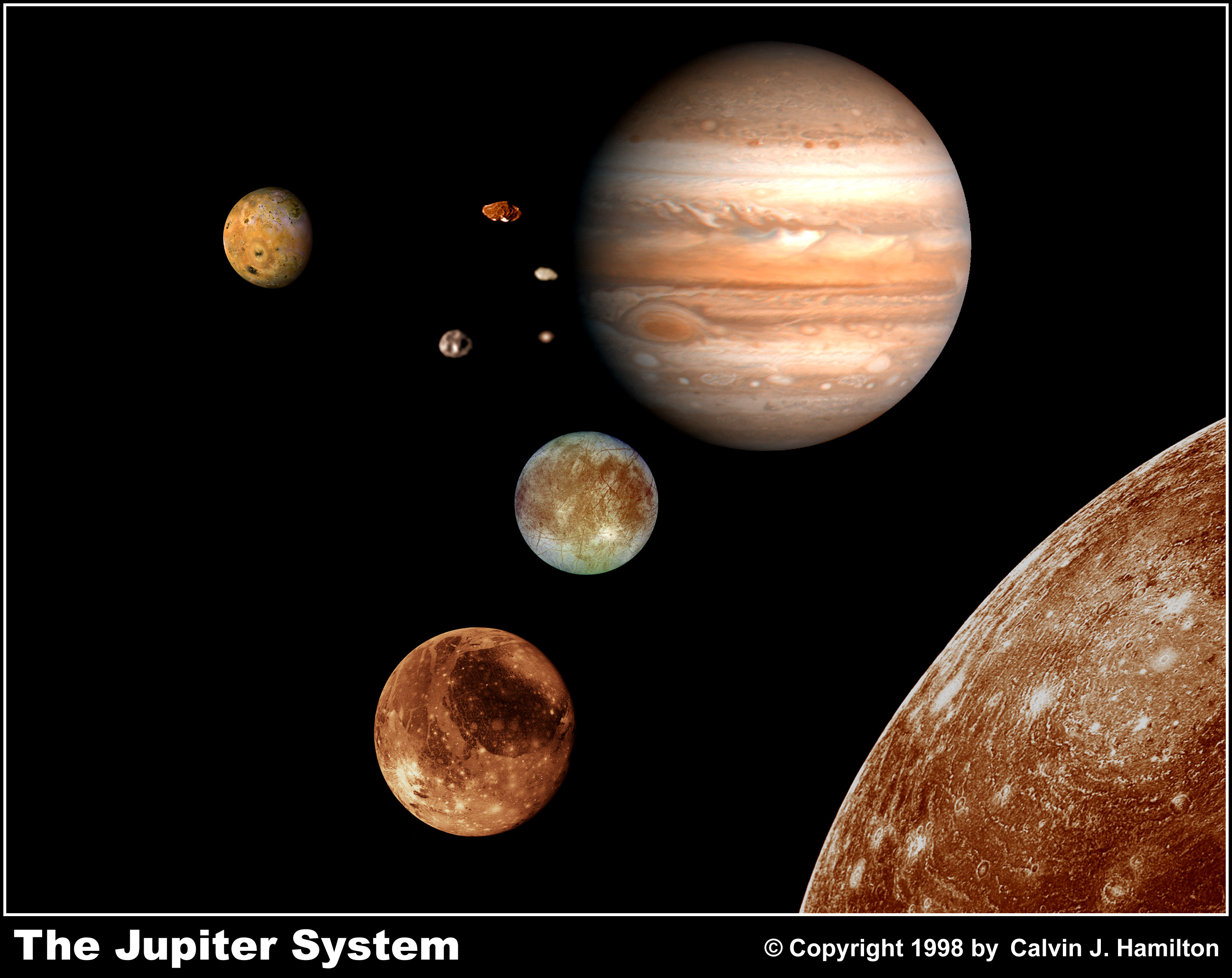 The best of the Jupiter system is pictured in this collage of images acquired by the Voyager and Galileo spacecraft. Jupiter is the largest planet in our solar system. The four largest moons of Jupiter are known as the Galilean moons and are named Callisto, Ganymede, Europa, and Io. Inside the orbits of the Galilean moons are Thebe, Amalthea, Adrastea, and Metis. At the lower right is shown the Valhalla region of Callisto. Ganymede is toward the bottom middle. Europa is a little above and to the right of Ganymede. Io is the top, left-most moon. Between Io and Jupiter are four little moons. The top-most little moon is Amalthea. Below and to the right of Amalthea are Metis and Adrastea. To the left of Adrastea is Thebe. |