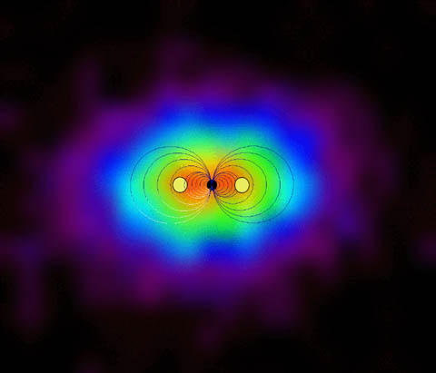 This image taken on January 4 and 5, 2001, by the ion and neutral mass spectrometer instrument on NASA's Cassini spacecraft makes the huge magnetosphere surrounding Jupiter visible in a way no instrument on any previous spacecraft has been able to do. The magnetosphere is a bubble of charged particles trapped within the magnetic environment of the planet. In this picture, a magnetic field is sketched over the image to place the energetic neutral atom emissions in perspective. This sketch extends in the horizontal plane to a width 30 times the radius of Jupiter. Also shown for scale and location are the disk of Jupiter (black circle) and the approximate position (yellow circles) of the doughnut-shaped torus created from material spewed out by volcanoes on Io, one of Jupiter's large moons. Some of the fast-moving ions within the magnetosphere pick up electrons to become neutral atoms, and once they become neutral, they can escape Jupiter's magnetic field, flying out from the magnetosphere at speeds of thousands of kilometers, or miles, per second. Cassini's instrument for imaging the magnetosphere builds an image from these atoms reaching the spacecraft, analagous to the way a normal camera builds an image from photons. Cassini is a cooperative mission of NASA, the European Space Agency and the Italian Space Agency. JPL, a division of the California Institute of Technology in Pasadena, manages Cassini for NASA's Office of Space Science, Washington, D.C. |