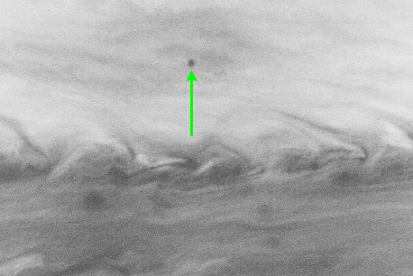 This is one of the discovery images of Thebe. It was taken by the Voyager 1 spacecraft 4 hours 26 minutes before the closest approach to Jupiter. This image is a wide angle picture taken at a range 4.3x105 kilometers. The dark circular disk is the shadow of Thebe and not the actual planet. Once the shadow images were analyzed, Thebe was located on several other images. This image is Copyright © by Calvin J. Hamilton. Any commercial/for-profit use of this image needs to be addressed to Calvin J. Hamilton. |