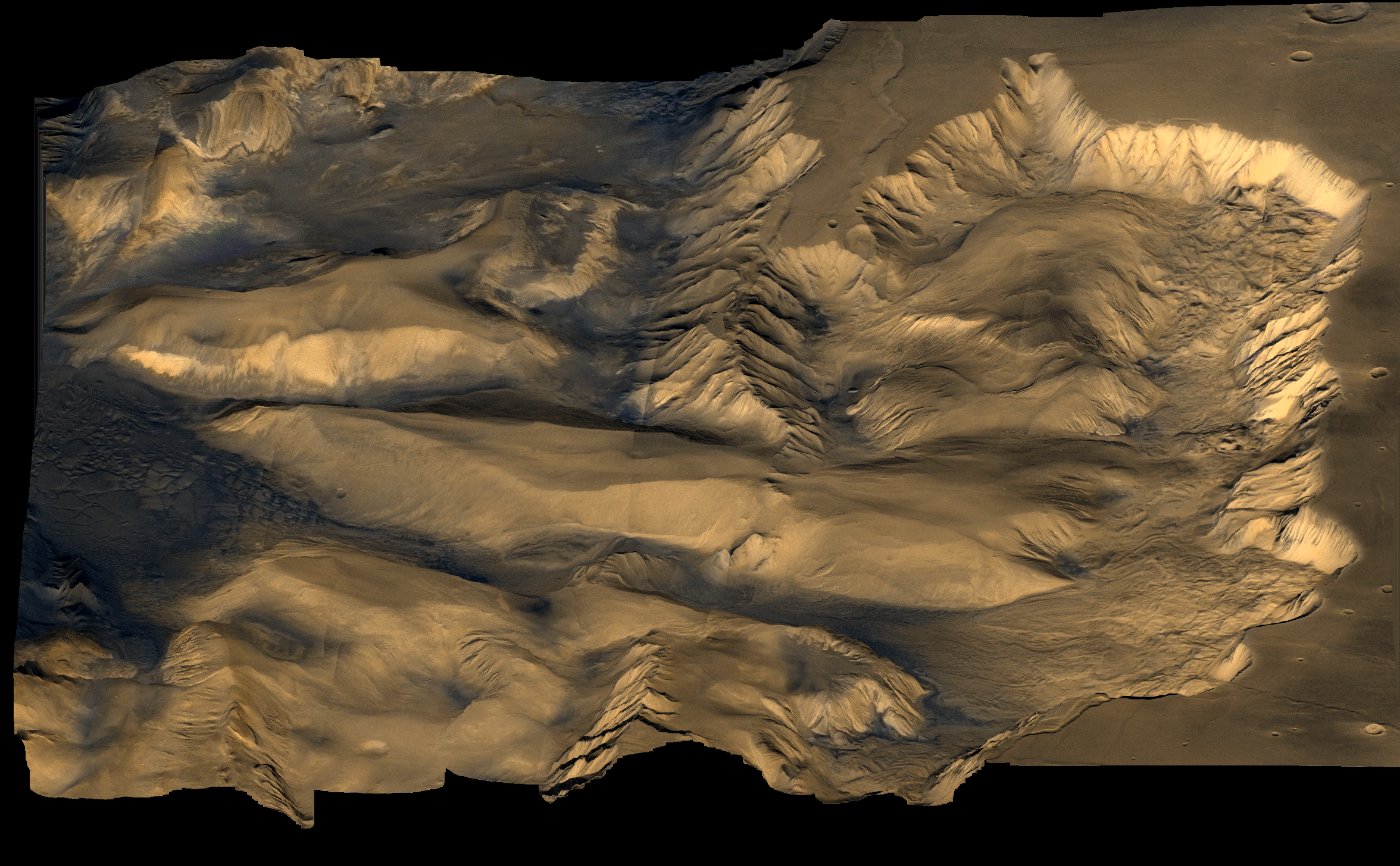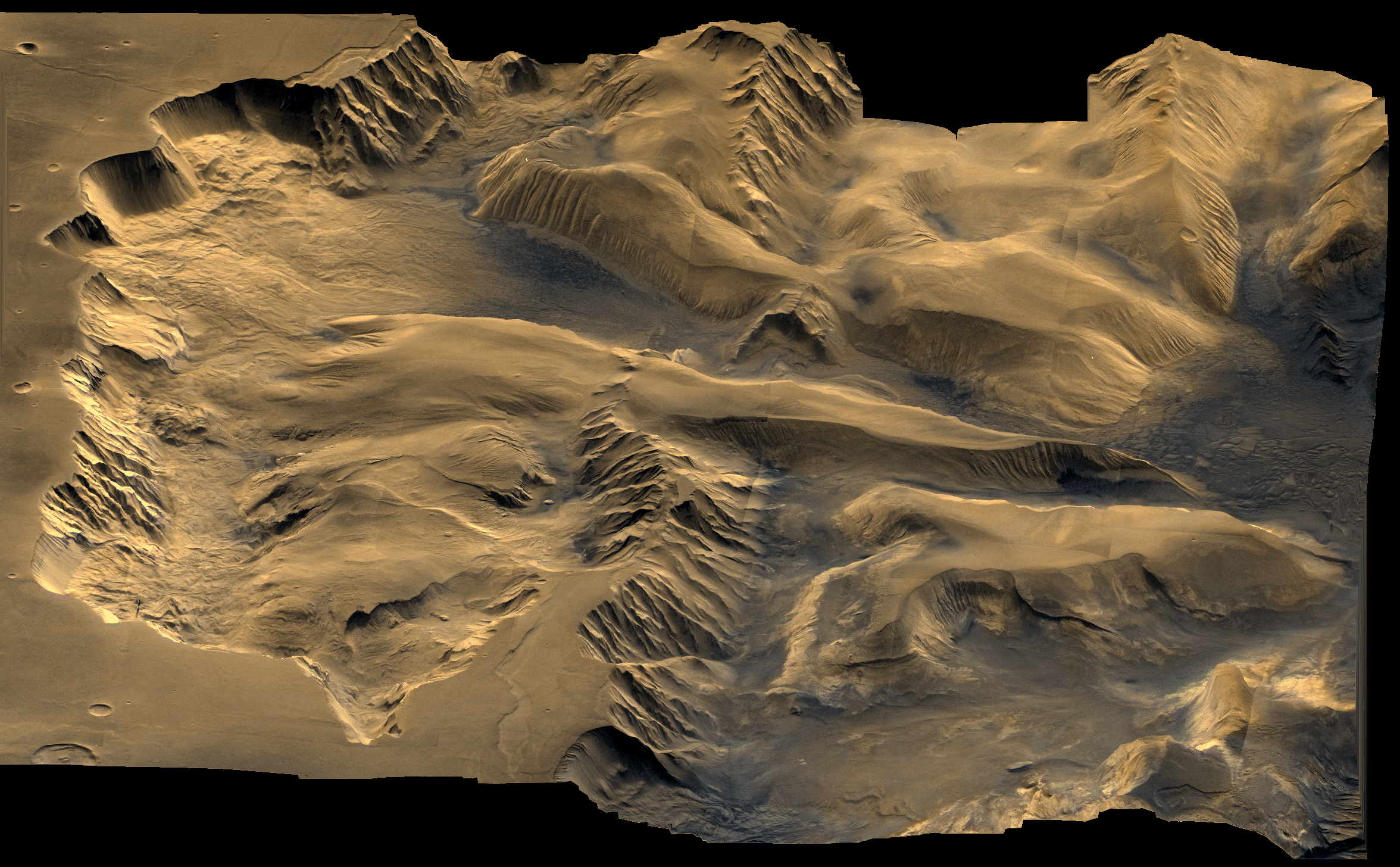 This image shows part of Candor Chasm in Valles Marineris. It is centered at Latitude -5.0, Longitude 70.0. The view is from the north looking into the chasm. Candor Chasm's geomorphology is complex, shaped by tectonics, mass wasting, wind, and perhaps by water and volcanism. The first two images are looking from the north, followed by views from the south, east and west. |