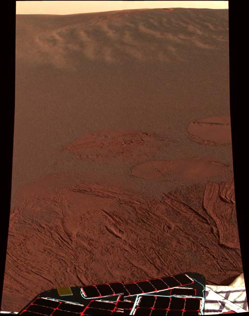 This color image shows the martian landscape at Meridiani Planum, where the Mars Exploration Rover Opportunity successfully landed at 9:05 p.m. PST on Saturday. This is one of the first images beamed back to Earth from the rover shortly after it touched down. |