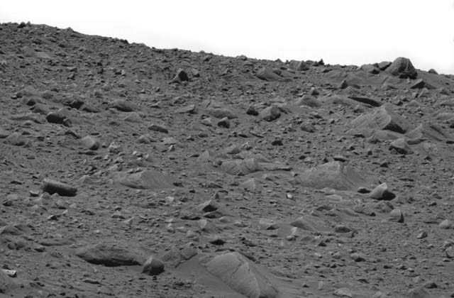 This image taken by the panoramic camera on the Mars Exploration Rover Spirit shows the rocky road the rover traversed to reach its current position 16 meters (52 feet) away from the rim of the crater called "Bonneville." The terrain here slopes upward about five degrees. To the upper right is the rock dubbed "Hole Point," which is about 60 centimeters (two feet) across. This image was taken on the 63rd martian day, or sol, of Spirit's mission. |