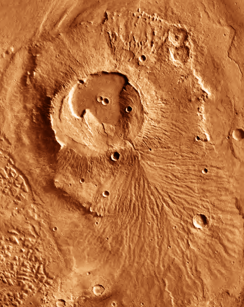 This view of Apollinaris Patera, shows characteristics of an explosive origin and an effusive origin. Incised valleys in most of the flanks of Apollinaris Patera indicates ash deposits and an explosive origin. On the west side (left), landslides that have shaped its surface also indicate ash deposits. Towards the south flank, a large fan of material flowed out of the volcano. This indicates an effusive origin. Perhaps during its early development Apollinaris Patera had an explosive origin with effusive eruptions taking place later on. This image is Copyright © by Calvin J. Hamilton. Any commercial/for-profit use of this image needs to be addressed to Calvin J. Hamilton. |