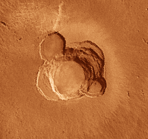 This complex caldera is composed of several discrete centers of collapse where the older collapse features are cross-cut by more recent collapse events. The lowermost circular floor preserves the last lava flooding event that followed the last major collapse. The southern wall of the caldera has at least 3 kilometers (1.9 miles) of vertical relief with an average slope of at least 26° (from horizontal). The caldera complex truncates several lava flows, indicating that the flows predate the collapse event and that their source areas have been destroyed by the caldera formation. This image is Copyright © by Calvin J. Hamilton. Any commercial/for-profit use of this image needs to be addressed to Calvin J. Hamilton. The caption is from LPI. |