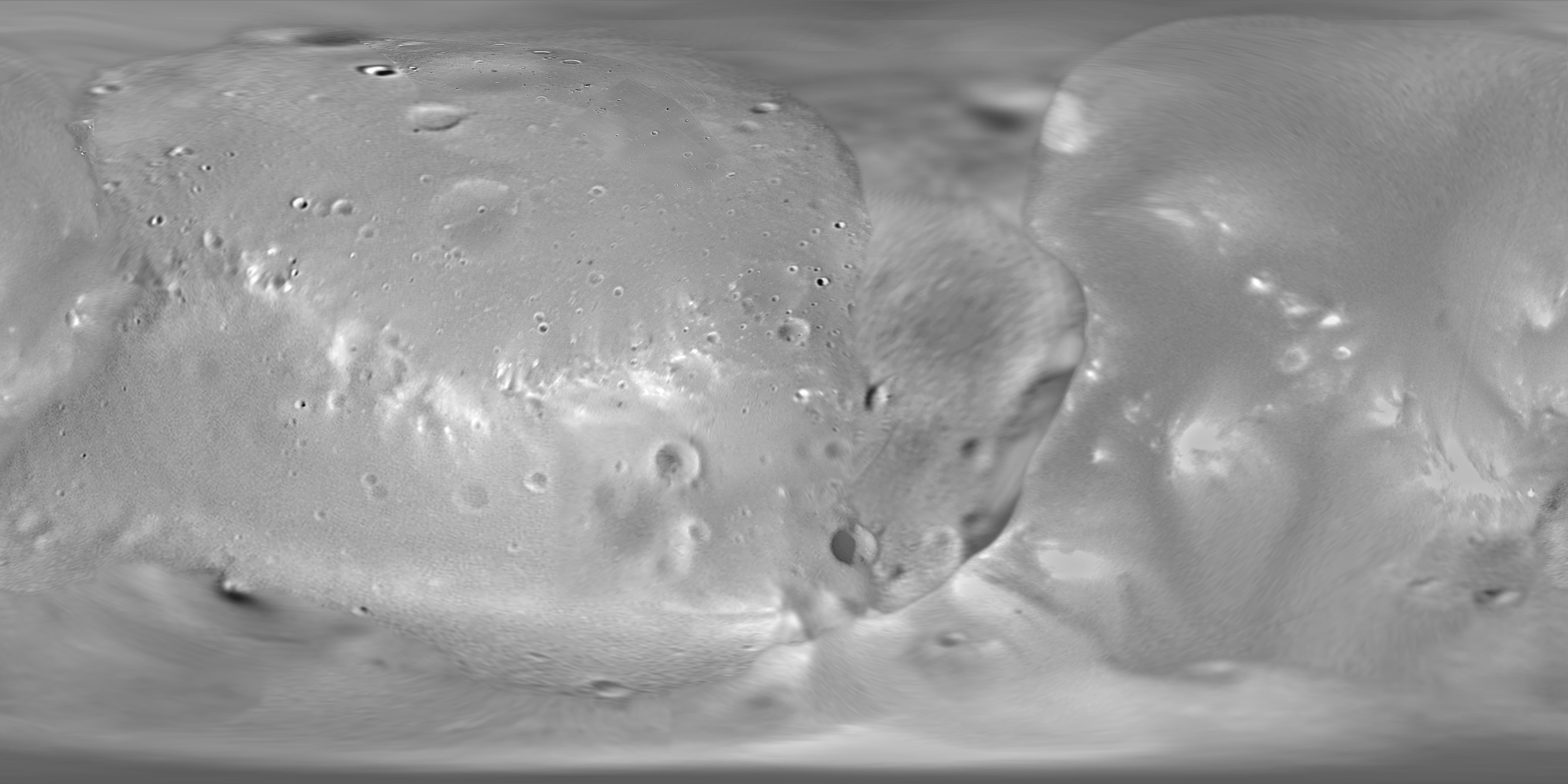 This cylindrical map of Deimos was created by Philip Stooke with the assistance of Chris Jongkind and Megan Arntz. Control is based on a shape model and mosaic by Peter Thomas and colleagues at Cornell University. |