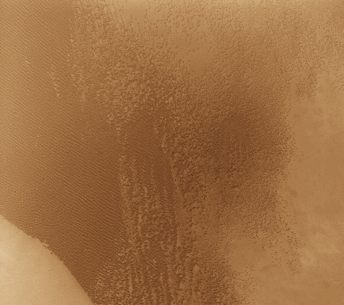 This image shows several dune types which are found in the north circumpolar dunefield. This thumnail image shows a section of transverse dunes. The full image has a field of traverse dunes on the left and barchan dunes on the right with a transition zone inbetween. Transverse dunes are oriented perpendicular to the prevailing wind direction. They are long and linear, and frequently join their neighbor in a low-angle "Y" junction. Barchan dunes are crescent-shaped mounds with downwind-pointing horns. These dunes are comparable in size to the largest dunes found on the Earth. This image is Copyright © by Calvin J. Hamilton. Any commercial/for-profit use of this image needs to be addressed to Calvin J. Hamilton. |