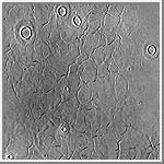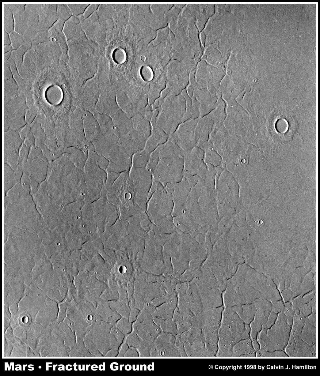 This region of fractured terrain is located just north of Isidis Planitia at 38&176; N latitude, and 253° W longitude. The intersecting cracks form polygonal patterns and divide the surface into a mosaic of blocks |